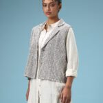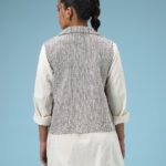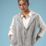 A structured yet effortless vest crafted in handwoven fabric, featuring intricate linear textures that celebrate artisanal craftsmanship. Designed with a relaxed fit, notch lapel, and contrast button detailing, this versatile piece adds depth to any ensemble. Perfect for layering, the vest brings a balance of tradition and contemporary style, making it a timeless wardrobe essential.