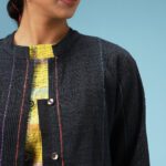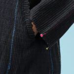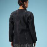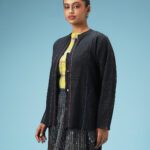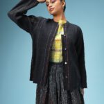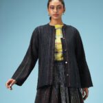 A structured, handwoven jacket in deep black with subtle multicolored pinstripes. The Orbit Short Vest features a mandarin collar, front button closure, and long sleeves with raw-edged hems for an artisanal touch. Its relaxed silhouette and textured fabric make it a versatile layering piece, perfect for adding depth and character to any outfit.