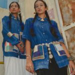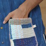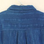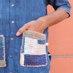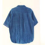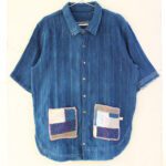 This half-sleeved shirt, dyed in indigo, features pockets adorned with patchwork and hems finished using recycled textile waste. The shirt is adorned with multi-colored buttons and showcases Kantha embroidery in various sections. Fabric is woven from waste sent to us by a garment factory based in Kolkata and kala cotton yarn.