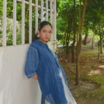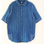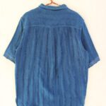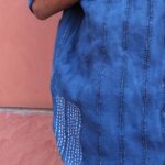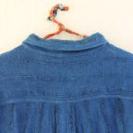 This half-sleeved shirt, dyed in indigo adorned with multi-colored buttons and showcases Kantha embroidery in various sections. Fabric is woven from waste sent to us by a garment factory based in Kolkata and kala cotton yarn.