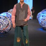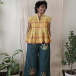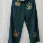 Ankle-length high-rise pants with elastic for comfort fit. The pants feature an exuberant extra weft motif of hands in Dabu print, dyed in natural indigo.
